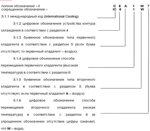 Методы охлаждения, применимые к конкретному электродвигателю, обозначаются специальной буквенно-цифровой маркировкой. Буквенная комбинация IC с добавлением других букв и цифр характеризует сам двигатель и тип его охлаждения. Маркировка может быть как полной, так и сокращенной. Рассмотрим далее основные обозначения типов охлаждения для трехфазных асинхронных электродвигателей.