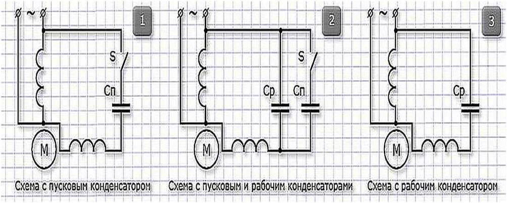 Если необходимо подключить двухфазный электродвигатель конденсаторного типа, то порядок действий описан ниже. Для двигателей данного типа характерен шум, но отсутствие запуска без конденсатора (при использовании методики подключения пускового мотора). С конденсаторами можно работать одним из трех способов.